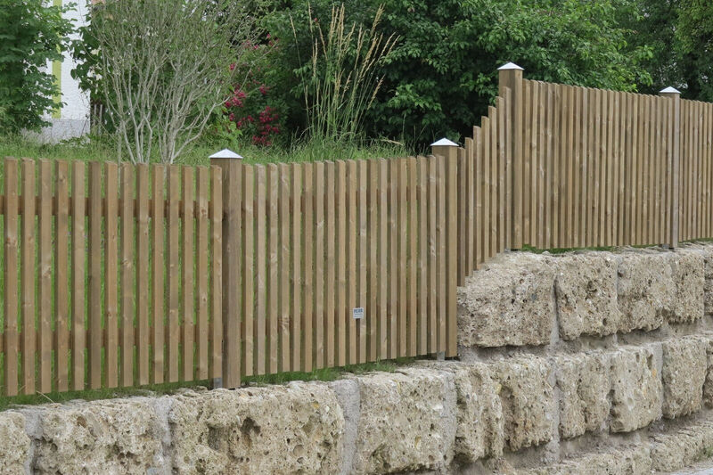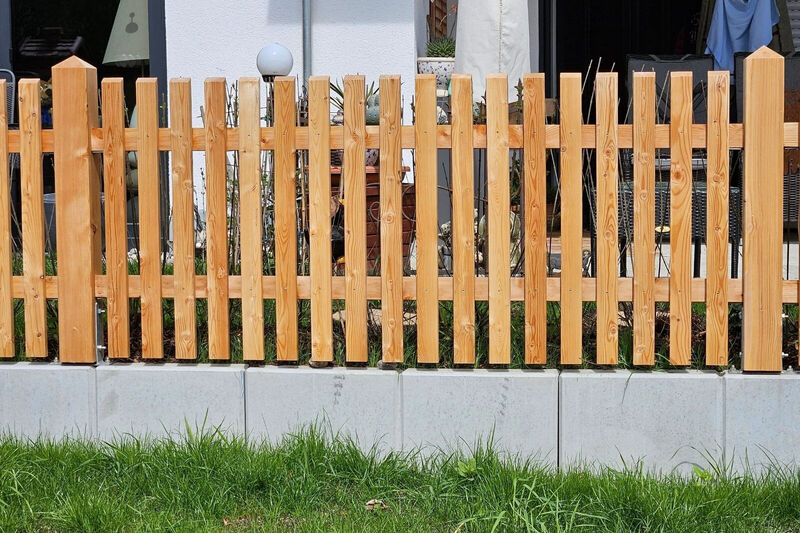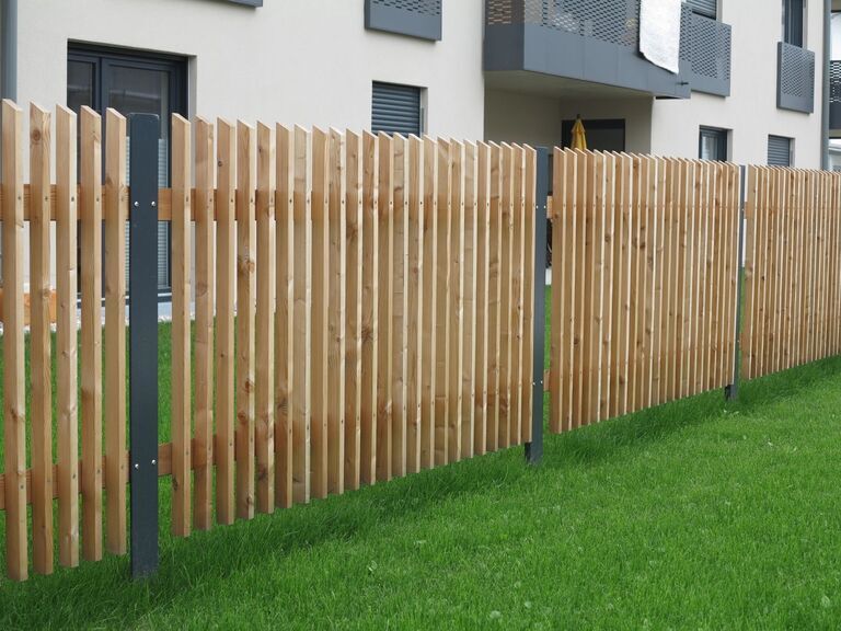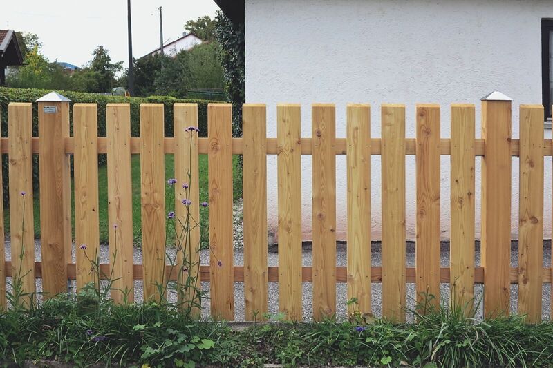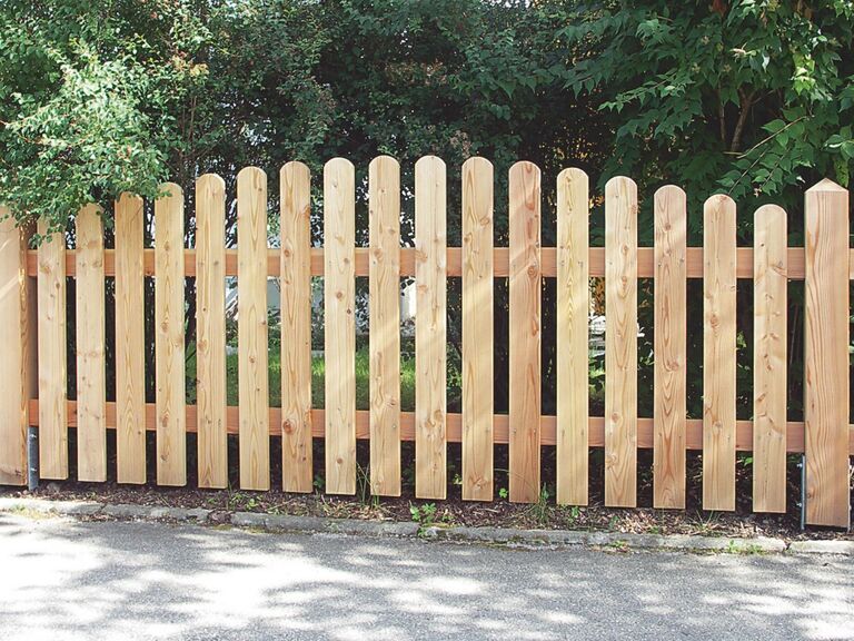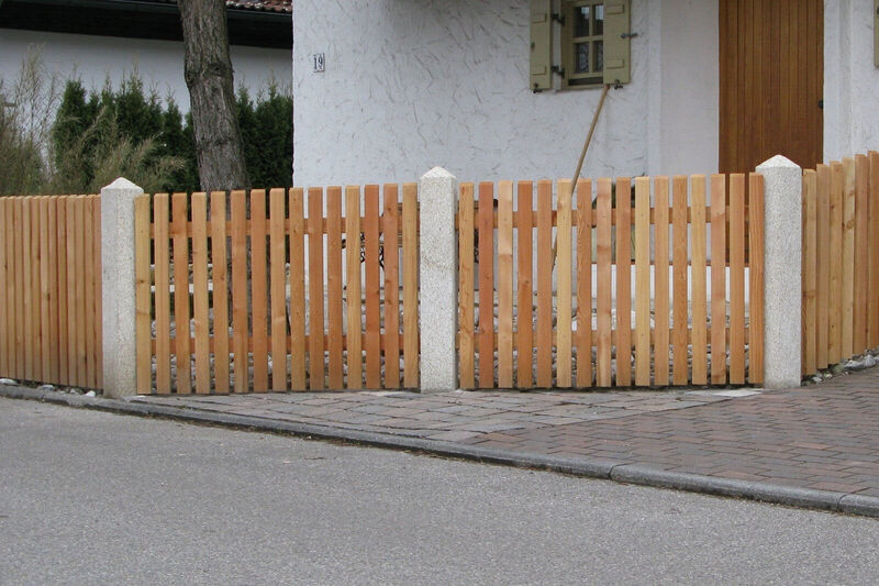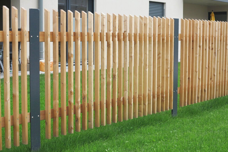 Für maximale Stabilität werden Vierkantpfosten auf ca. 70 cm tief einbetonierte H-Eisen montiert. Dazwischen sorgen stabile Bindstangen mit verdeckten Halterungen für eine sichere und optisch ansprechende Verbindung. Die senkrechten Hobellatten werden – je nach gewünschtem Sichtschutz und Design – mit einem Abstand von etwa 4 bis 5 Zentimetern auf die Querhölzer geschraubt. So entsteht ein harmonisches Gesamtbild mit optimaler Durchlüftung und klassischer Zaunoptik