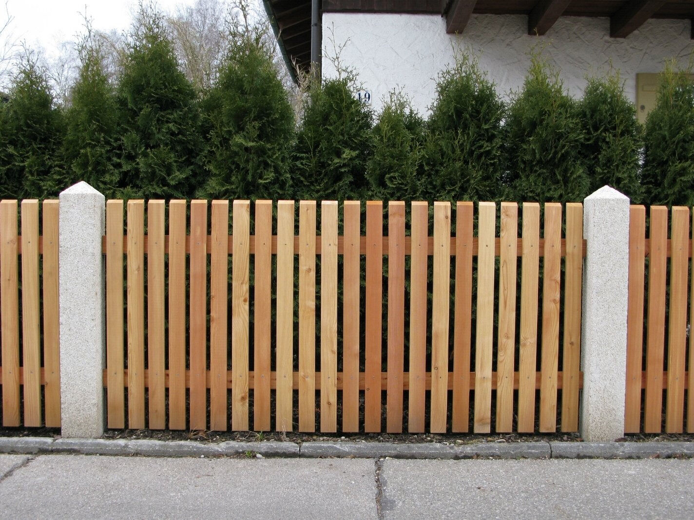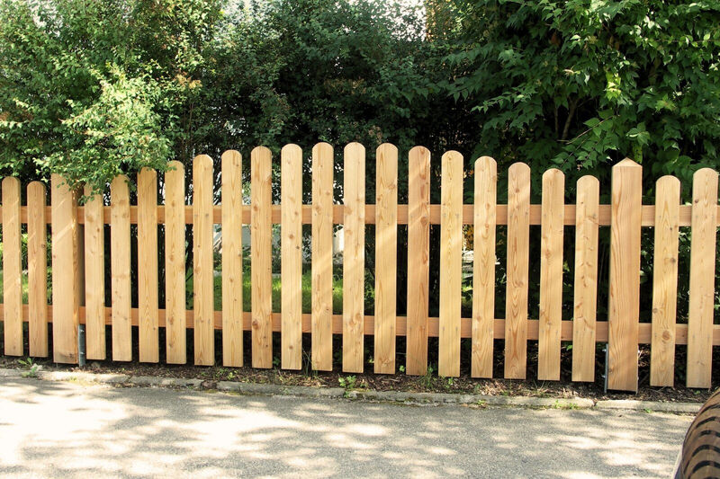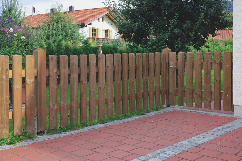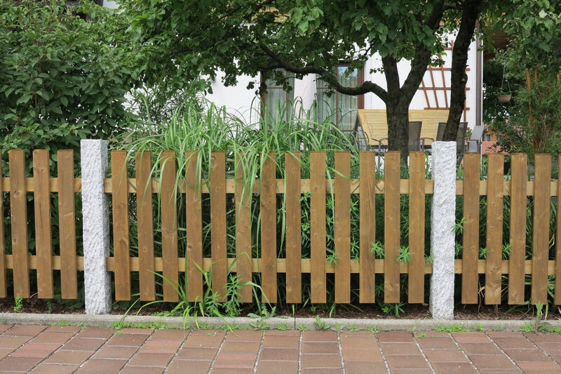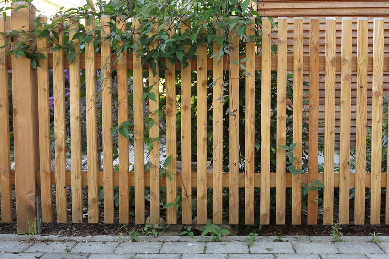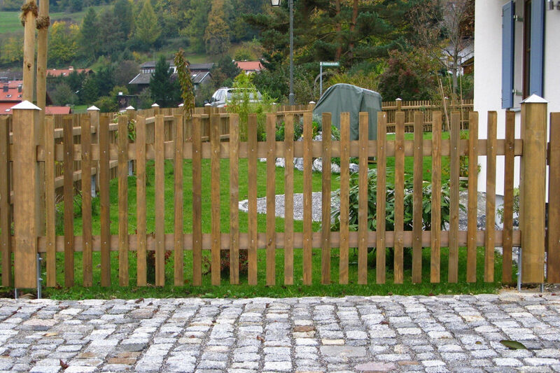 Für maximale Stabilität werden Vierkantpfosten auf ca. 70 cm tief einbetonierte H-Eisen montiert. Dazwischen sorgen stabile Bindstangen mit verdeckten Halterungen für eine sichere und optisch ansprechende Verbindung. Die senkrechten Hobellatten werden – je nach gewünschtem Sichtschutz und Design – mit einem Abstand von etwa 4 bis 5 Zentimetern auf die Querhölzer geschraubt. So entsteht ein harmonisches Gesamtbild mit optimaler Durchlüftung und klassischer Zaunoptik