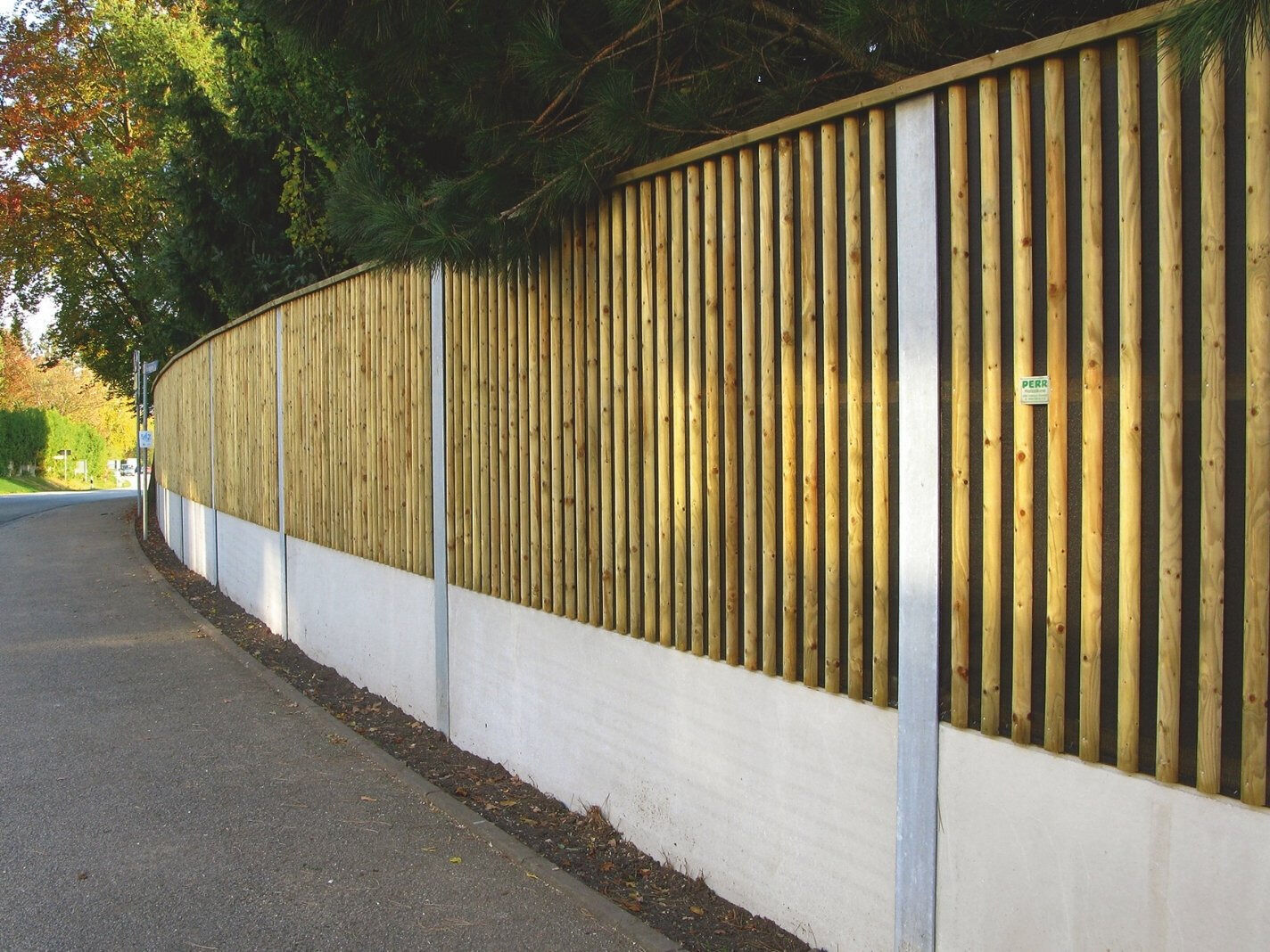 Unsere Lärmschutzwände werden individuell nach Maß gefertigt. Übliche Elementbreiten betragen 4,00 m, Höhen sind bis zu 3,00 m in einem Element möglich. Größere Wandhöhen werden auf mehrere Elemente aufgeteilt und mit Nut- und Federverbindungen sowie Dichtbändern dauerhaft dicht verbunden. Mit einem geprüften Schalldämmmaß von 32 dB bieten die hochabsorbierenden Lärmschutzwände System Perr eine leistungsstarke, nachhaltige und wirtschaftliche Lösung für effektiven Schallschutz im privaten, gewerblichen und kommunalen Bereich.